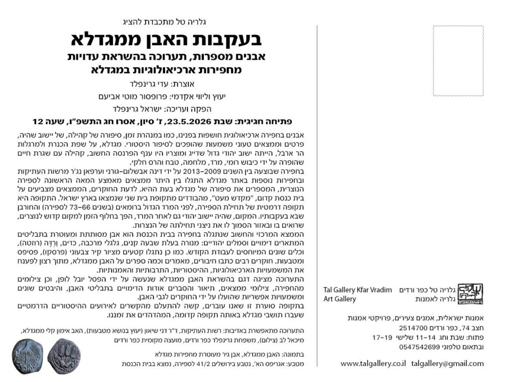 התערוכה מציגה העתק מפוסל בהשראת האבן ממגדלה שנעשתה על ידי הפסל יובל לוטן, וכן צילומים מהחפירה, צילומי הממצאים, והדימויים בתבליטי האבן, ומתארת היבטים שונים ומשמעויות אפשריות שהועלו על ידי החוקרים לגבי האבן.